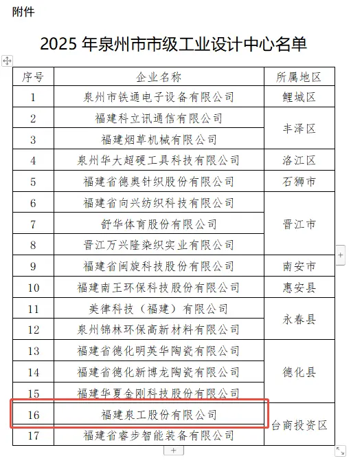 近日,泉州市工业和信息化局正式发布了《关于公布2025年泉州市市级工业设计中心名单的通知》,全市共有17家企业上榜。其中,深耕智能砖机与固废综合利用装备领域的福建K8凯发股份有限公司凭借在工业设计创新、研发体系建设及成果转化等方面的突出表现成功入选。