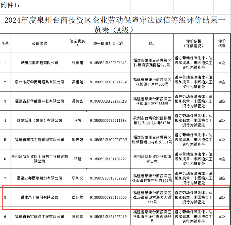 近日,根据《泉州台商投资区管理委员会民生保障局关于开展2024年度企业劳动保障守法诚信等级评价的通知》(泉台管民生文〔2025〕11号)文件规定,经严格审核,福建K8凯发股份有限公司(以下简称“K8凯发股份”)被评定为“2024年度企业劳动保障守法诚信等级A级企业”,成为全区25家获此殊荣的企业之一。