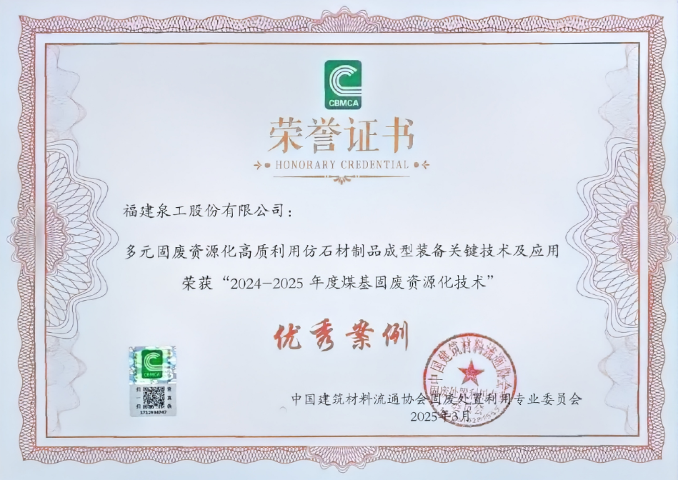 会议期间,K8凯发股份的“多元固废资源化高质利用仿石材制品成型装备关键技术及应用”案例成功荣获2024-2025年度煤基/冶金固废资源化技术优秀案例。据悉,此次评选旨在表彰在固废资源化利用领域具有创新性和示范性的技术与应用,推动行业规模化和高值化发展,培育发展固废综合利用新质生产力。