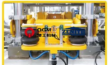 当模具转运至主机位置时,其吊装系统在快速换模装置上实现自动换模。上下模气动自动夹紧,安全、高效、操作简单、维护便利。主要包括: 气动模具夹紧装置:主要由由模具支架和两侧的气动夹紧杆组成,在主机进行预振和主振时,协助夹紧固定模具及减振作用,以实现最佳振动效果并延长模具的使用寿命。 气动压头锁紧装置:压头通过带有气囊的夹持装置进行固定,可轻松快速地更换压头,缩短模具更换安装时间,保证下模框和上压头精准对接。 电动模具插入装置:模具安装装置用于将模具安装到主机中,并通过电动模具托架将模具从机器中送入及取出,模具托架可适用于市场上大多数模具,特殊模具可使用特殊模具托架。 换模装置:安装在主机机架上,用于换模时模具的吊装,配有电动链式葫芦及电动行走装置。